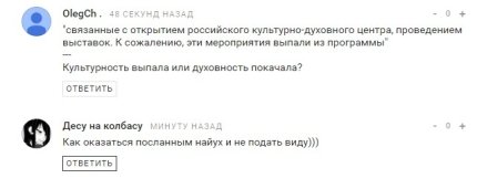"Дело в том, что планировались некоторые мероприятия, связанные с открытием российского культурно-духовного центра, проведением выставок. К сожалению, эти мероприятия выпали из программы, и поэтому президент принял решение пока визит во Французскую Республику отменить", — сказал пресс-секретарь президента РФ.
