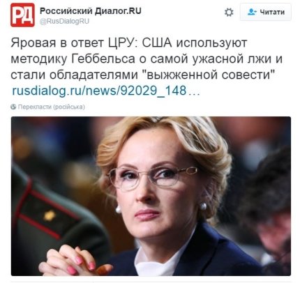 "Такое впечатление, что ЦРУ используют самую опасную в истории человечества идеологию: чем чудовищнее ложь, тем охотнее в нее поверят, которую исповедовал Геббельс", - подчеркнула Яровая.