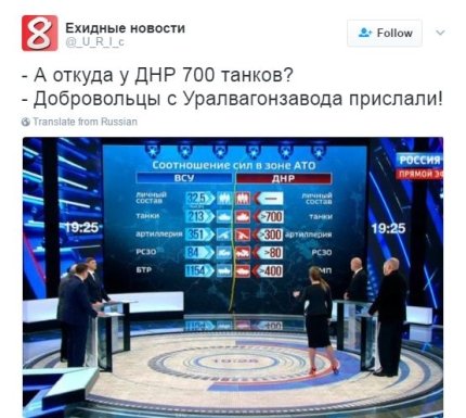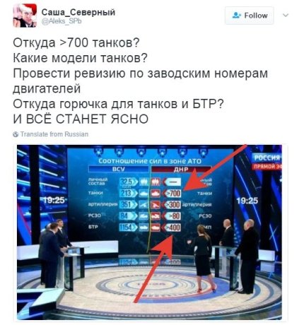 В то же время в соцсетях вспомнили информацию, озвученную в росСМИ накануне: журналисты в эфире телеканала Россия 1 заявили, что на вооружении у боевиков ДНР 700 российских танков.