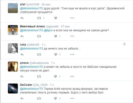 "На встрече с Путиным Тереза Мэй нарушила протокол: она должна была первой протянуть руку мужчине, но забыла об этом", - написал в Twitter журналист кремлевского пула Дмитрий Смирнов.