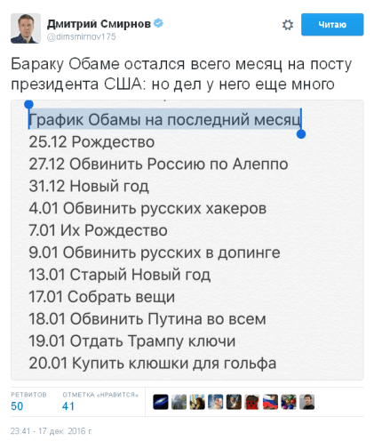 "Бараку Обаме остался всего месяц на посту президента США, но дел у него еще много", - написал Смирнов.