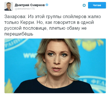 "Из этой группы спойлеров жалко только Керри. Но, как говорится в одной русской пословице, плетью обаму не перешибёшь", — попыталась пошутить Захарова.