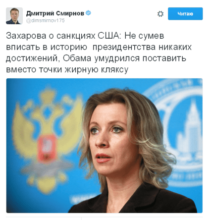 После введения санкций против России президентом США Бараком Обамой официальный представитель российского МИД Мария Захарова разразилась гневными заявлениями в адрес Белого дома; в свою очередь, соцсети высмеяли саму чиновницу.
