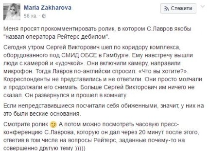 "Если не представившиеся посчитали себя обиженными, значит, у них на это были веские основания. Смотрите ролик ;) А потом можно посмотреть часовую пресс-конференцию С.Лаврова, которую он дал через 20 минут после этого, ответив в том числе на вопросы Рейтерс, заданные почему-то на совершенно другую тему )))))", - добавила Захарова.