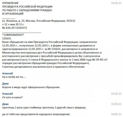 А 14 мая 2015 года «Дева» отправляет письмо в Администрацию Президента РФ и предлагает Мозгового с его организаций в качестве третьей силы на Донбассе, с которой могут договариваться в России, Украине и во всем мире.