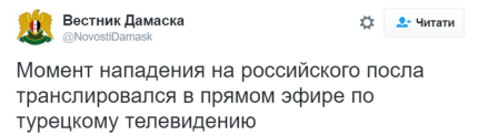 Отметим, что в соцсетях уже появились первые комментарии к происшедшему. Так, блогер, пишущий под ником Савелий Вассерман, написал: "В Анкаре убили посла России в Турции. За Аллепо".