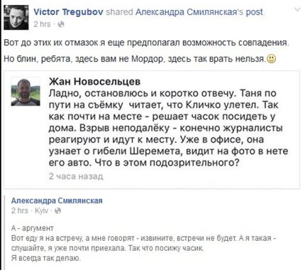 Согласно его версии, журналистка канала по пути в центр Киева узнала, что мэра Кличко нет на месте, но почему-то решила «часок посидеть у дома (дома Кличко рядом с местом убийства Шеремета - Ред)».