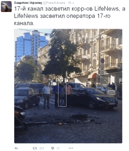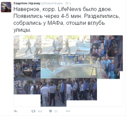 «Наверное, корр. LifeNews было двое. Появились через 4-5 мин. Разделились, собрались у МАФа, отошли вглубь улицы», — отметили они.