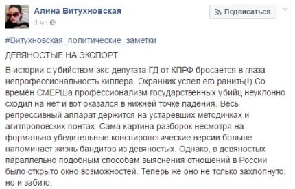 "В истории с убийством экс-депутата ГД от КПРФ бросается в глаза непрофессиональность киллера. Охранник успел его ранить(!) Со времён СМЕРШа профессионализм государственных убийц неуклонно сходил на нет и вот оказался в нижней точке падения. Весь репрессивный аппарат держится на устаревших методичках и агитпроповских понтах. Сама картина разборок несмотря на формально убедительные конспирологические версии больше напоминает жизнь бандитов из девяностых. Однако, в девяностых параллельно подобным способам выяснения отношений в России было открыто окно возможностей. Теперь же оно не только захлопнуто, но и забито", - написала Витухновская.