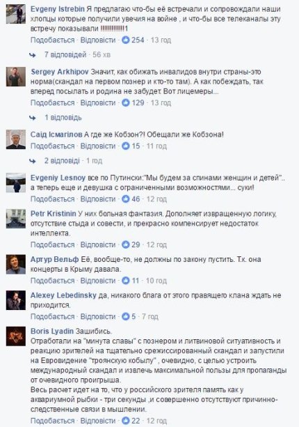 Известный журналист Айдер Муждабаев, переехавший в Украину из России, прокомментировал решение РФ: "Подлая лютая злая страна-убийца, чей настоящий символ — мужик на танке, выбрала представлять себя девушку на инвалидной коляске. Убийцы всегда прикрывают свою сущность слезой ребёнка. От всего, что они творят, нормального человека может только тошнить. Все первые ряды на Евровидении правительство Украины должно выкупить и отдать тем, кто потерял возможность ходить из-за войны на Донбассе".