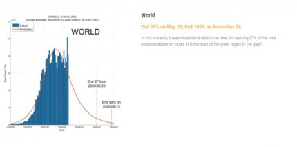 Кроме того, ученые отмечают, что в США вспышка коронавируса завершится 5 сентября, в Великобритании - 20 августа, в Германии - 5 августа, во Франции - 8 августа, в Италии - 30 августа и в России - 19 августа. Если брать средние цифры по миру, то пандемия завершится 20 октября. Также указано, что дольше всего эпидемия будет продолжаться в Бахрейне - до 6 апреля 2021 года.