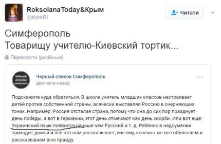 В сети распостранили сообщение крымского сепаратиста, жалующегося на проукраинского учителя в школе: "В школе учитель младших классов настраивает детей против собственной страны, всячески выставляя Россию в очерняющих тонах. Например: Россия отсталая страна, потому что она до сих пор празднует день победы, а вот в Германии этот день отмечают как день скорби; украинский язык появился раньше русского, и т.д".