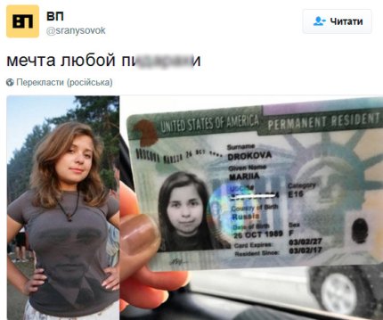 Бывшая активистка российского путинского движения "Наши" Мария Дрокова получила "грин-карту" в США, развеселив новостью соцсети.