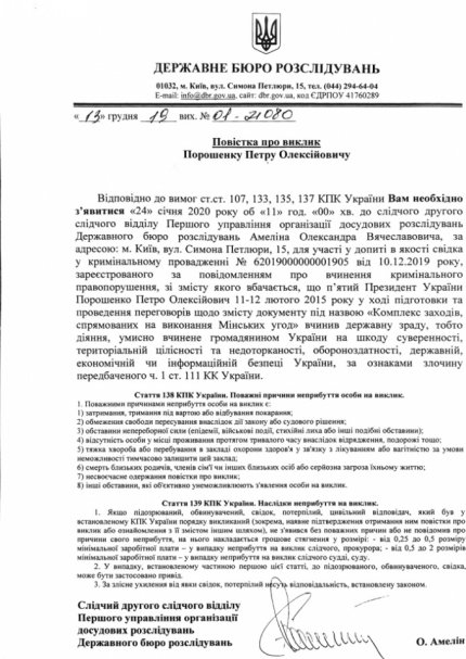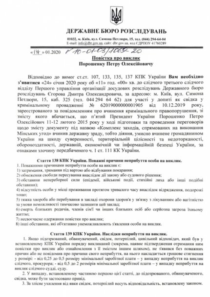 В обнародованных повестках указано, что на допрос Порошенко вызывают по уголовным делам относительно его возможной госизмене в ходе подготовки Минских соглашений от 2015 года. В документах указано, что экс-глава Украины вызывается на допрос в качестве свидетеля.