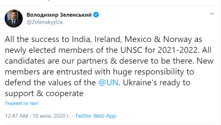 "Желаю успеха Индии, Ирландии, Мексике и Норвегии в качестве новых избранных членов Совета безопасности ООН на 2021-2022 годы. Все кандидаты являются нашими партнерами и заслуживают того, чтобы быть там. На новых участников возложена огромная ответственность по защите ценностей ООН. Украина готова поддерживать и сотрудничать", − подчеркнул Зеленский.