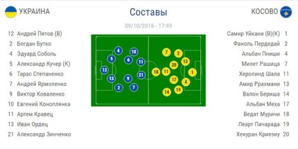 Опубликованы стартовые составы на матч третьего тура отборочного турнира на ЧС-2018 между сборными Украины и Косово.