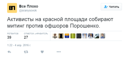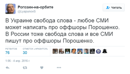 "То, как отреагировали украинцы на публикацию, свидетельствующую о регистрации их президентом офшорных фирм, уже демонстрирует, как современная Украина отличается от современной России. Практически никто не утверждает, что глава государства может делать все, что хочет. Нет, дискуссия идет главным образом о мере ответственности. О политических последствиях – будут они или нет. О том, что должны предпринимать недавно только сформированные антикоррупционные органы. И сторонники, и оппоненты Петра Порошенко не сомневаются в том, что он – такой же гражданин, как и все остальные. Гражданин, который несет ответственность за свои поступки и свои проступки", - написал Виталий Портников.