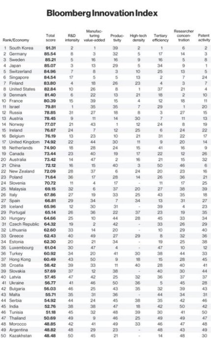 Первое место с показателем 91,31 пункта заняла Южная Корея, за ней расположились Германия, Швеция, Япония и Швейцария. США заняли 8-е место в рейтинге, РФ – 12, Китай – 21.