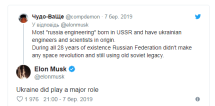 Известный американский изобретатель и основатель SpaceX Илон Маск признает, что Украина сыграла ведущую роль в становлении советской, а теперь российской космической отрасли. Так он отреагировал в Twitter на комментарий к своему твиту, передает ONLINE.UA.