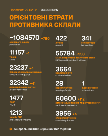 Общие боевые потери противника с 24.02.22 по 03.09.25 ориентировочно составили: