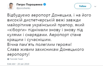 "Восстановим аэропорт Донецка, и на его высокой диспетчерской башне всегда будет развеваться украинский флаг, который "киборги" поднимали снова и снова под пулями и снарядами. Аэропорт станет лучше и более современным", - заявил Порошенко.