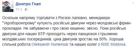 При этом, чтобы не покупать моторы напрямую из России, дочернее предприятие "Укроборонпрома" - "Укринмаш", закупило 20 двигателей для БТР-80 через молдавские фирмы-посредники.
