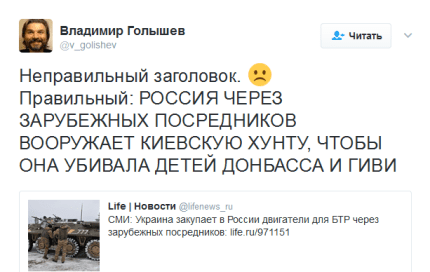 Между тем, новость о закупках Украиной комплектующих для военной техники в России с радостью подхватили российские пропагандистские СМИ, такие как РИА Новости и Life.ru.