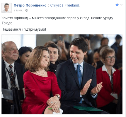 "Христя Фриланд – министр иностранных дел в составе нового правительства Трюдо. Гордимся и поддерживаем!" - написал глава государства.