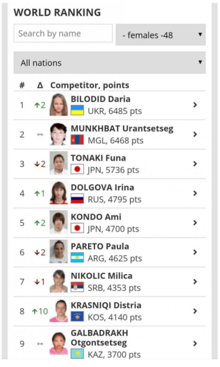 Украинка имеет преимущество в 17 пунктов над ближайшей соперницей – дзюдоисткой из Монголии Уранцецег Мунхбат.