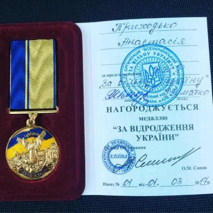 "Сегодня к нам в штаб пришла Настя Приходько. К сожалению, она не смогла быть с нами на мероприятии "Украина женского рода 2017" поэтому пришла сегодня. И мы с удовольствием вручили ей награду - медаль "За возрождение Украины" и награду "Ангелы любви". Удачи тебе, Настенька везде и всегда", - написала Шматко.