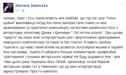 "Во время шоу "Голос країни" исполнительница Ингред Костенко использовала полностью мою аранжировку (а практически композицию) на мотивы украинской песни из репертуара коллектива "Древа з Крячківки" "Ой летіла зозуля". При этом "содрали" не только мою интерпретацию, но и фортепианную аранжировку немецкого композитора и пианиста Яри Сингля!" - написала артистка.