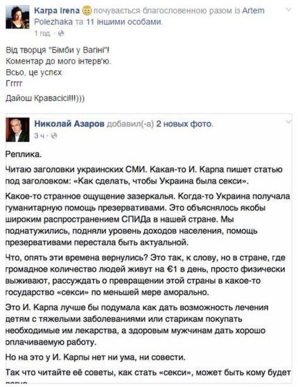 Николай Азаров написал, что нашел статью Ирены Карпы под заголовком "Как сделать, чтобы Украина была секси".