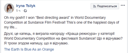 Украинская режиссер Ирина Цилик стала триумфатором престижного американского кинофестиваля Sundance. Ее документальный фильм "Земля голубая, как апельсин" о жизни на Донбассе победил в категории "Лучшая режиссура" Об этом сообщает ONLINE.UA со ссылкой на страницу режиссера в Facebook.