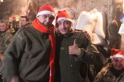 "Как положено, поздравить воинов прибыли "Дед Мороз" и "Снегурочка" - и ничего, что Снегурочка была обута в берцы, а у Деда Мороза из-под красной шубы все время выглядывал пиксельный камуфляж. Что вместо праздничных салютов небо вспыхивало трассерами, а звуки хлопушек заменяли враждебные бабахи от обстрелов соседних Бутовки и промки. А у нас - были песни и стихи, настоящие подарки (термокружки от одесских и киевских волонтеров и флисовые шарфы), праздничные торты и угощение. И елка была настоящая, с гирляндами и блестящими игрушками. И даже День рождения у бойца получился настоящим: с поздравлениями от друзей и подарками!", - рассказали бойцы.