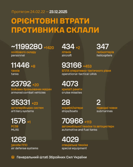 Общие боевые потери противника с 24.02.22 по 23.12.25 ориентировочно составили: