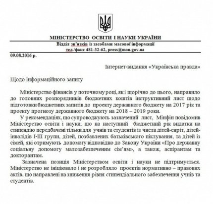 "Минфин сообщил Министерству образования и науки, что на следующий бюджетный год расходы на стипендию предусмотрены только для учеников и студентов из числа детей-сирот, детей-инвалидов I-III группы, детей, лишенных родительской опеки, и детей из семей, которые получают помощь в соответствии с Законом Украины "О государственной социальной помощи малообеспеченным семьям", а также аспирантам и докторантам", - говорится в ответе МОН.