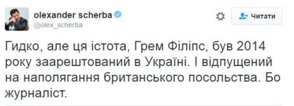 "Противно, но это существо, Грэм Филлипс, был 2014 арестован в Украине. И отпущен по настоянию британского посольства. Потому что журналист", - написал Щерба.