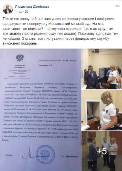 "Документы (разрешение на посещение Сущенко - ред. ) возвращено в Московский городской суд. На мой вопрос - это отказ? - прозвучал ответ - езжайте в суд, там все знают. Письменный ответ тоже не предоставили", – сказано в сообщении.