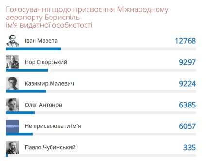 За Мазепу отдали голоса почти 12800 человек, тогда как за ставшего вторым Игоря Сикорского - чуть меньше 9300. Третьим стал Казимир Малевич, у которого чуть более 9220 голосов.