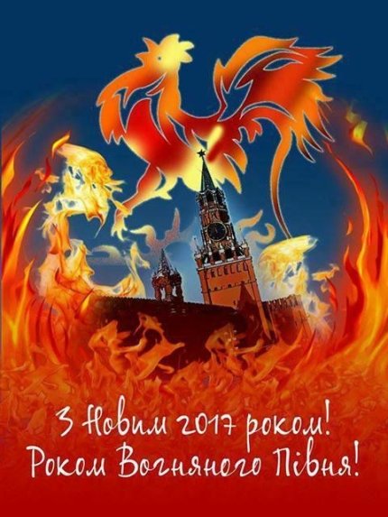 Как известно, согласно восточному календарю, 2017 год - это год Красного Огненного петуха. Именно он и изображен на открытке украинцев. Петух расположен выше Кремля, который охвачен огнем.