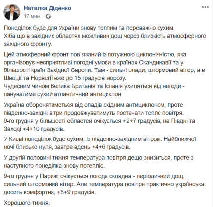 Во вторник и среду, 10 и 11 декабря, погода будет по-прежнему теплой и сухой. Небольшие осадки в виде мокрого снега и дождя ожидаются только на западе страны - в Ужгороде, Ивано-Франковске и Львове.