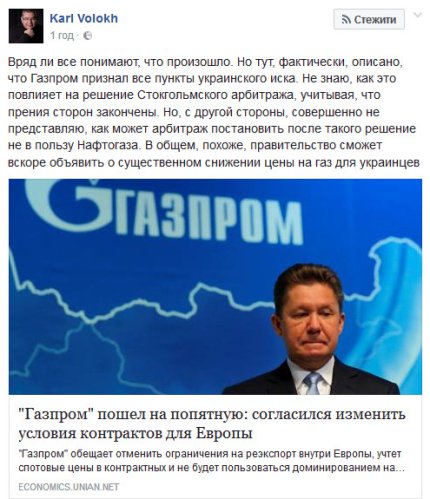 "Вряд ли все понимают, что произошло. Но тут, фактически, описано, что Газпром признал все пункты украинского иска. Не знаю, как это повлияет на решение Стокгольмского арбитража (который рассматривает споры "Нафтогаза" и "Газпрома" в том числе и о ценовой политике - ред.), учитывая, что прения сторон закончены".