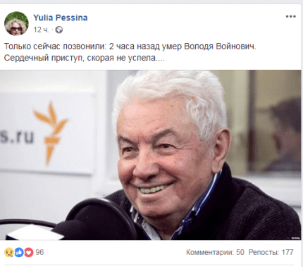 Первой о смерти Войновича сообщила его знакомая Юлия Пессина в соцсети, передает ONLINE.UA.
