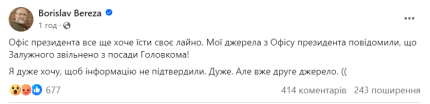 Бывший народный депутат Борислав Береза со ссылкой на свои источники в офисе президента также сообщил, что Залужного отправили в отставку.