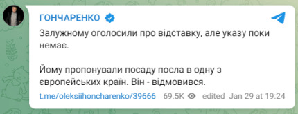 Нардеп Алексей Гончаренко написал, что Залужному вроде бы объявили об отставке, но указа пока нет. Депутат утверждает, что Залужному предлагали должность посла в одну из европейских стран, но он отказался.