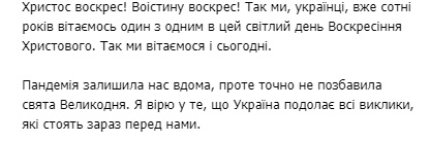 "Христос воскрес! Воистину воскрес! Так мы, украинцы, уже сотни лет приветствуем друг друга в этот светлый день Воскресения Христова. Так мы делает и сегодня. Пандемия оставила нас дома, однако точно не лишила праздника Пасхи. Я верю в то, что Украина преодолеет все вызовы, которые стоят сейчас перед нами", - подчеркнул глава Кабмина.