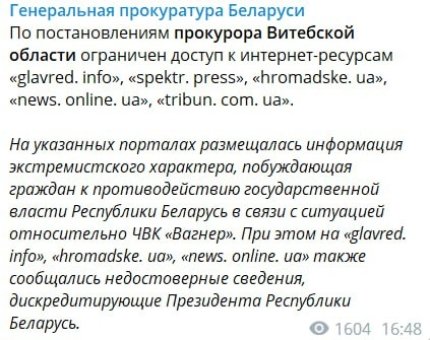 На указанных порталах размещалась информация экстремистского характера, побуждающая граждан к противодействию государственным властям Республики Беларусь, учитывая ситуацию с ЧВК "Вагнер", — сказано в заявлении представителей Генпрокуратуры.