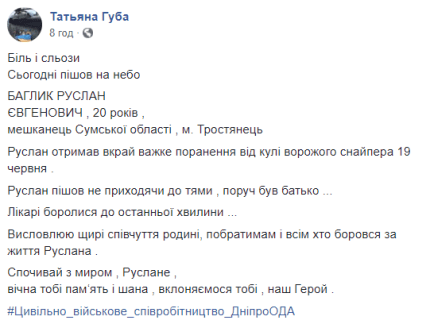 О смерти бойца ВСу сообщила советник председателя Днепропетровской ОГА Татьяна Губа на своей странице в соцсети, передает ONLINE.UA.