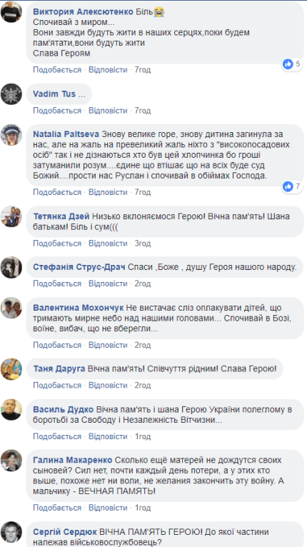 "Опять боль, боль, боль ... Она не утихает ... Искренние сочувствия родным и близким ... Держитесь, мы с Вами, делим боль за каждого Героя, который пошел держать Небо, потому что выдержать боль одному - невозможно ...", "Ведь это действительно тяжелая боль для его родителей, которые и не думали и не гадали хоронить своего в любви воспитанного ребенка в 20 лет(((", "Опять большое горе, опять ребенок погиб за нас, но увы к большому сожалению никто из "высокопоставленных лиц" так и не узнает, кем был этот парнишка, потому что деньги затуманили разум.... Единственное, что утешает, что на всех будет суд Божий.... Прости нас, Руслан, и покойся в объятиях Господа", - сочувствуют родителям погибшего украинского военного украинцы в соцсети.