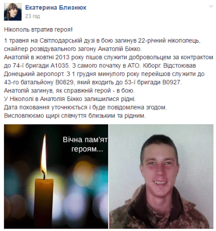 1 мая в ходе боевых действий в районе Светлодарской дуги на Донбассе погиб 22-летний украинский снайпер Анатолий Бижко.